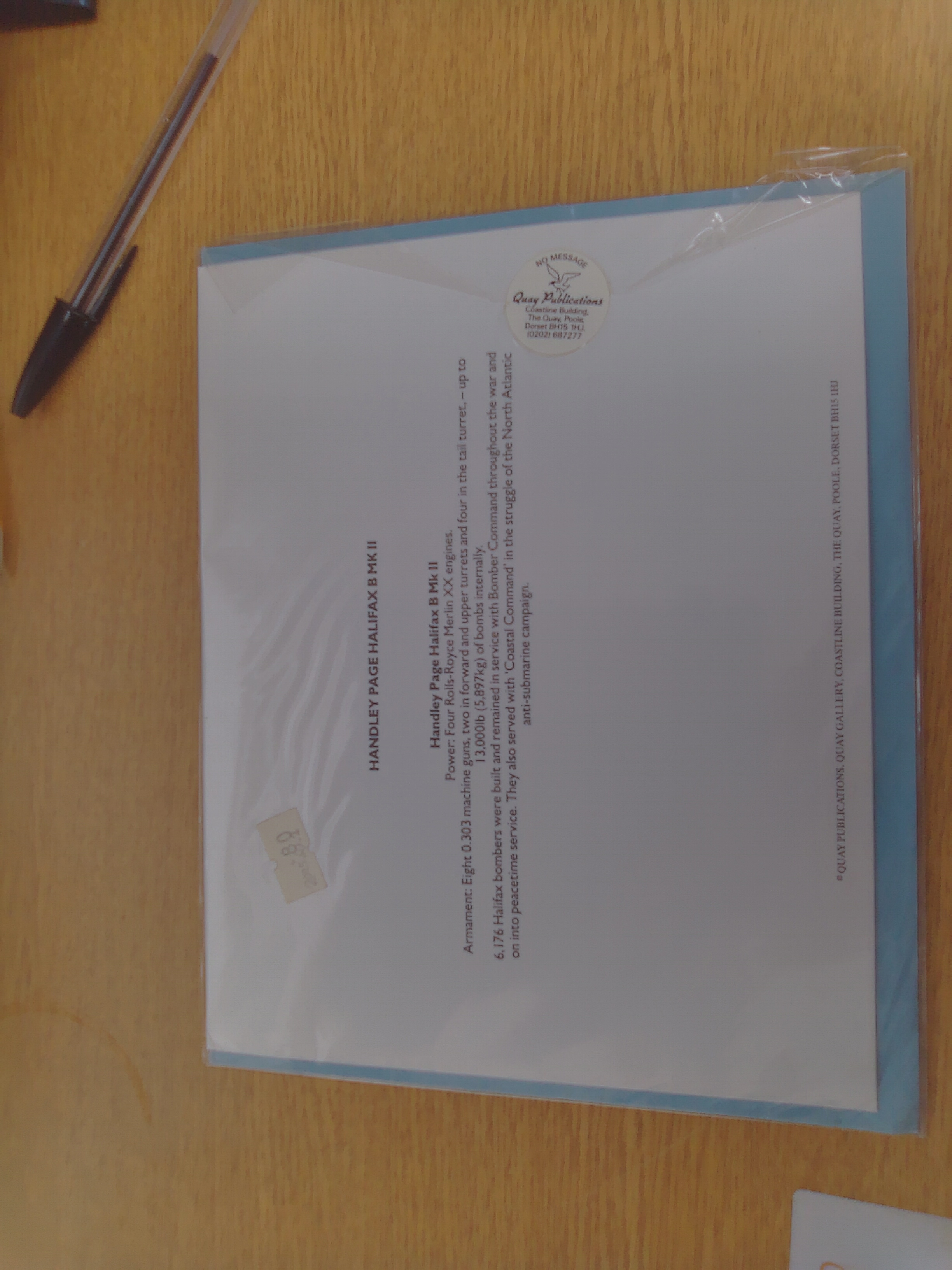 | Brief Description | A postcard with a blue envelope in a plastic wrapper. The front of the postcard features an illustration of a Handley Page Halifax heavy bomber. The back features a blurb identifying the aircraft. |
